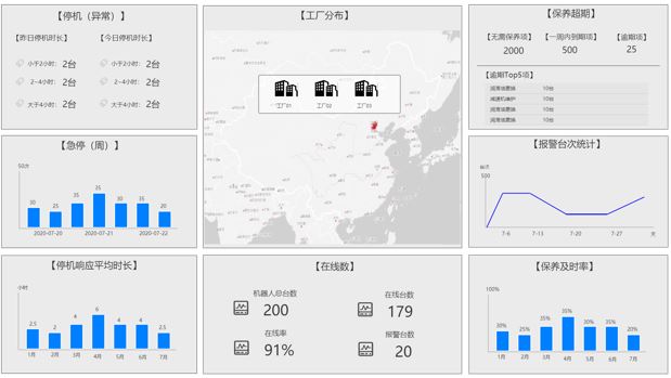 總覽整個工廠機器人的狀態及數據,查看設備總數以及設備的在線和報警狀態。通過圖表可以顯示機器人包括保養狀態、報警數量等信息,用戶可一覽整個工廠的機器人情況。