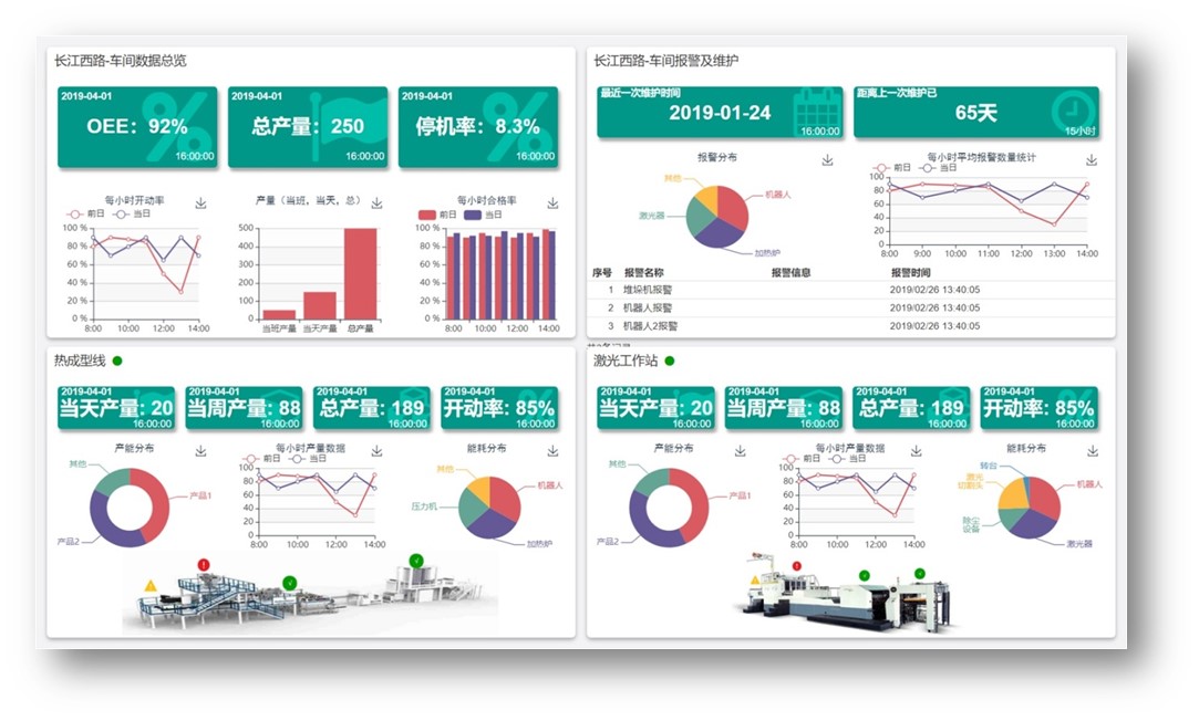 可展示生產宏觀數據,包括開動率,總產量,質量合格率。并預留相關接口:計劃完成率,安全生產天數和OEE。用戶可通過終端進行遠程訪問,以達到綜合監管的目的。并且用戶可自行定義想要展示的內容。